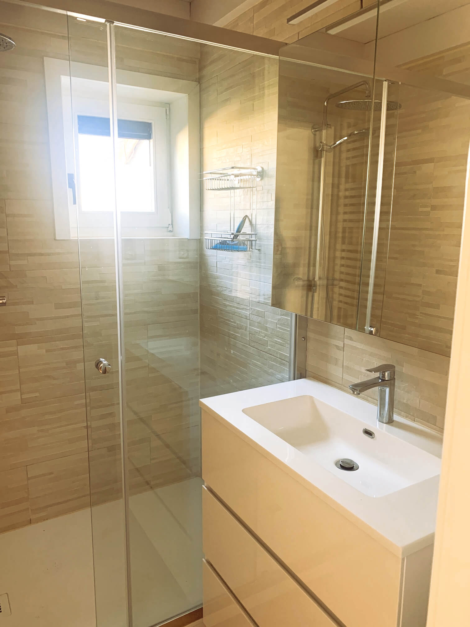 Das Ferienhaus verfügt über ein modernes Badezimmer mit einer großzügigen XXL-Regendusche sowie eine separate Toilette.