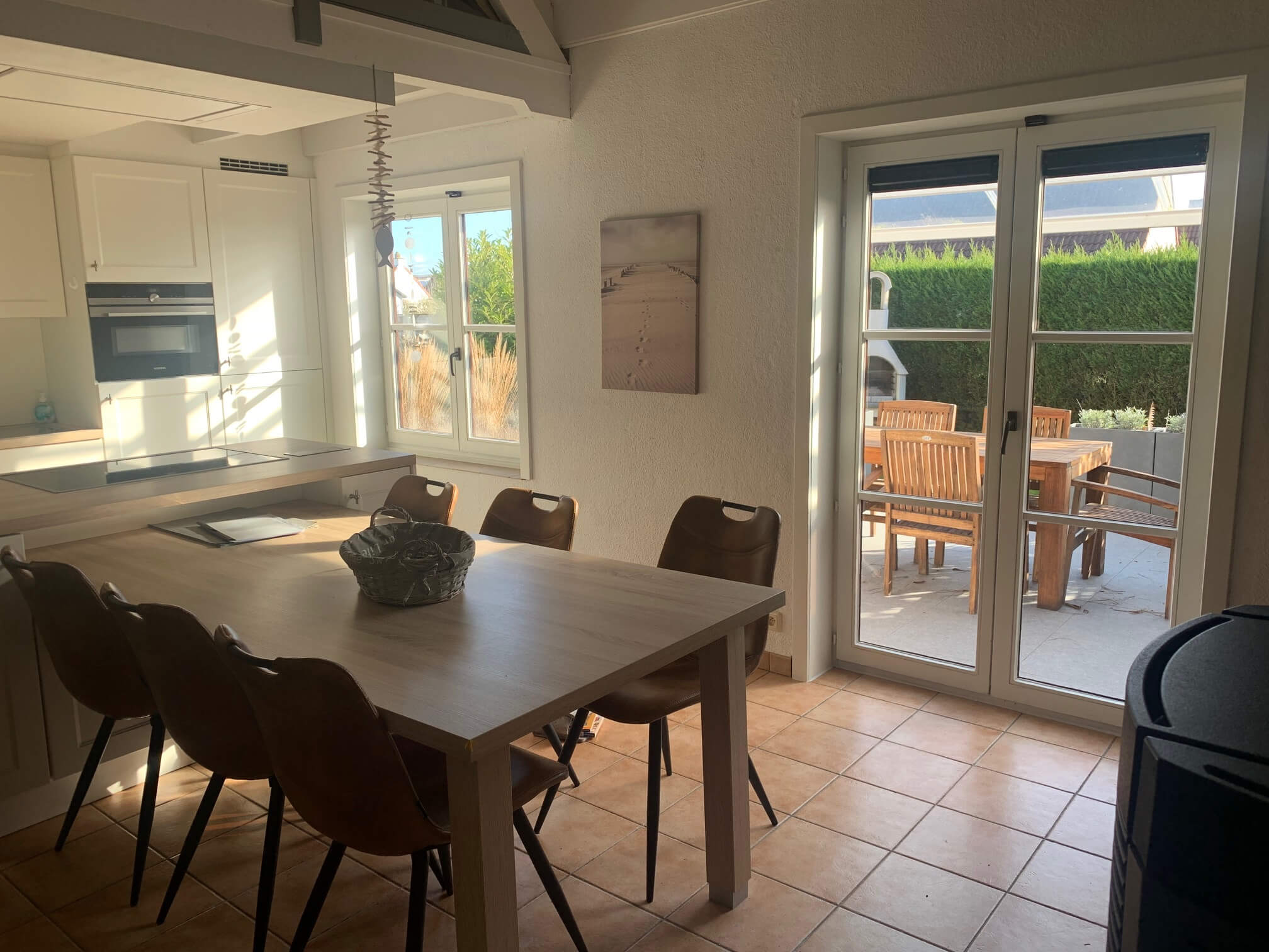 Die voll ausgestattete Küche bietet alles, was Sie für eine komfortable Selbstverpflegung benötigen: Backofen mit Mikrowellenfunktion, Induktions-Kochfeld, Geschirrspülmaschine, Filter-Kaffeemaschine, Wasserkocher, Toaster, Gefrierschrank und einen großen Kühlschrank. Zudem stehen Kochutensilien, Geschirr und eine Auswahl an Gewürzen bereit. Der angrenzende Essbereich bietet ausreichend Platz für bis zu sechs Personen.